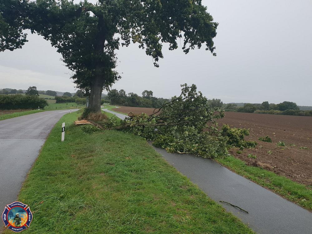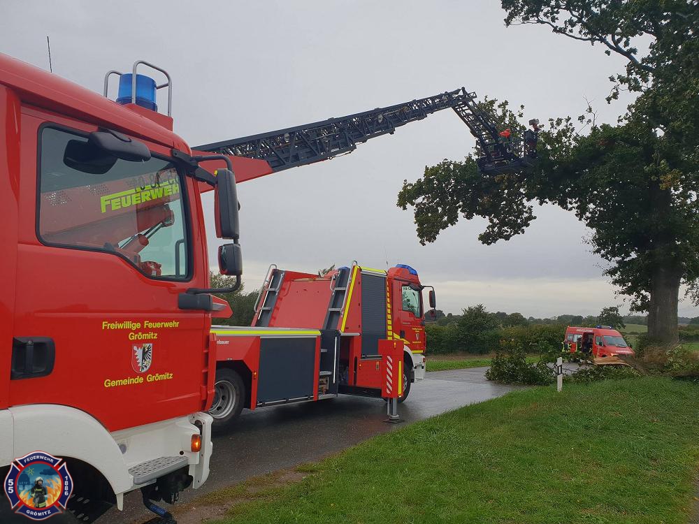 Bei Ankunft an der Einsatzstelle war bereits ein großer Ast auf den örtlichen Fahrradweg gefallen. Ein weiterer Ast drohte zu Fallen. Mittels Drehleiter und Motorkettensäge würde die Gefahr beseitigt. |