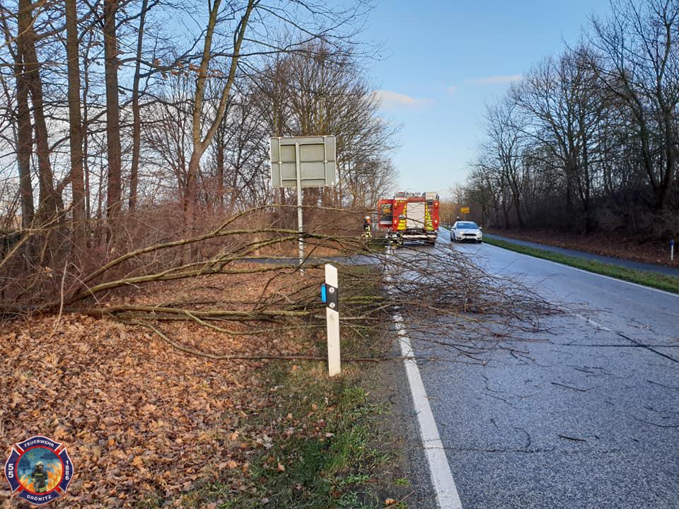 Baum auf Straße -> Der auf die Bundesstraße gefallene Baum wurde zerlegt und die Straße gesäubert. |