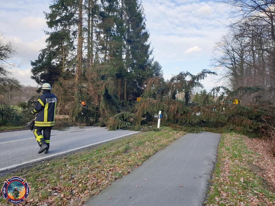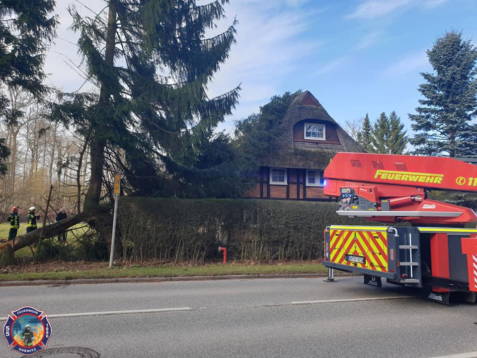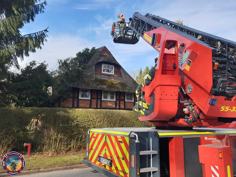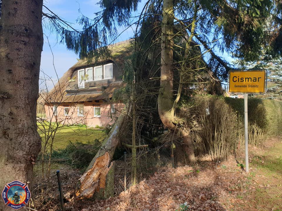 Baum auf Dach von Haus -> In Cismar war ein Baum durch Sturm umgeknickt und auf ein Haus gestürzt. Mittels Drehleiter, Motorkettensäge und Unterstützung vom Boden wurde die Gefahr beseitigt. Ein weiterer Baum der sich bereits gefährlich in Richtung Bundesstraße neigte wurde ebenfalls beseitigt. |