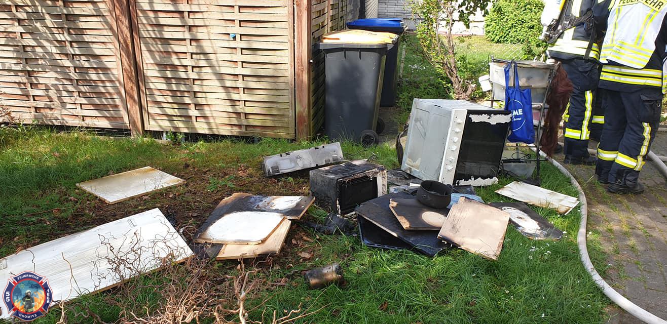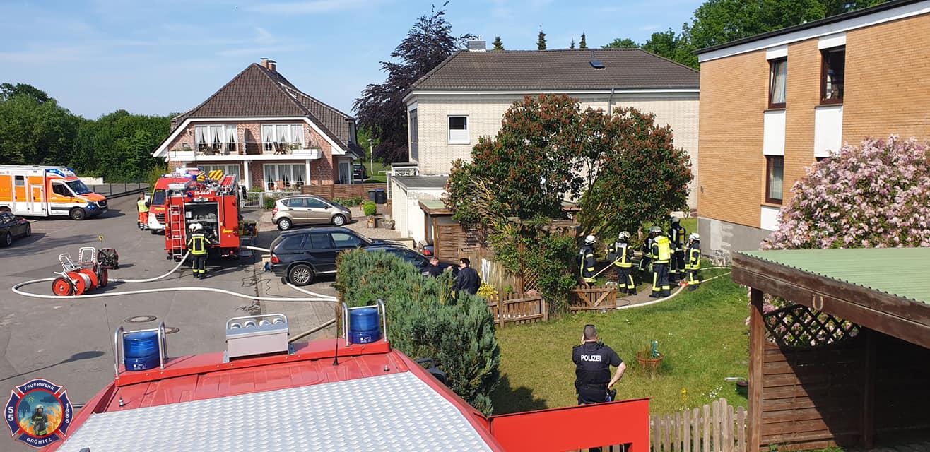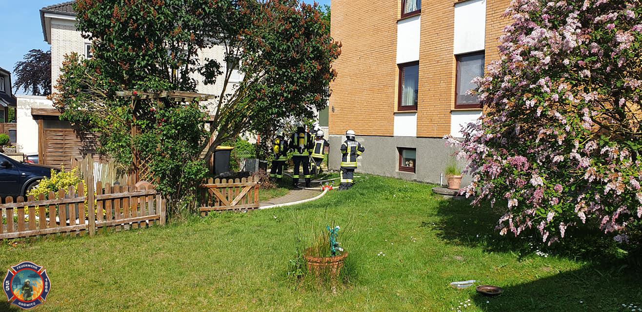 Treppenhaus stark verqualmt, mehrere Personen auf Balkon -> In der Souterrainwohnung eines Mehrfamilienhauses kam es zu einem Feuer in der Küche, das nach einer Öffnung der Wohnungseingangstür unter Atemschutz gelöscht werden konnte. Einige Teile des Brandguts wurden aus den Räumlichkeiten ins Freie verbracht. Die durch das Feuer entstandene Verrauchung des Treppenhauses verhinderte zunächst, dass die Bewohner im oberen Bereich des Gebäudes ihre Wohnung verlassen konnten. Dies war möglich nachdem umfangreiche Lüftungsmaßnahmen eingeleitet wurden. Per Steckleiter verschaffte sich ein Kamerad Zugang zur Wohnung im Obergeschoss um die Personen auf dem Balkon zu betreuen. |