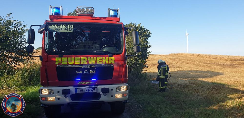 Da der, in der Ernte befindliche, Landwirt und sein Team bereits Erstmaßnahmen ergriffen hatten mussten wir vor Ort lediglich Nachlöscharbeiten durchführen. Nach kurzer Zeit konnten wir wieder einrücken.