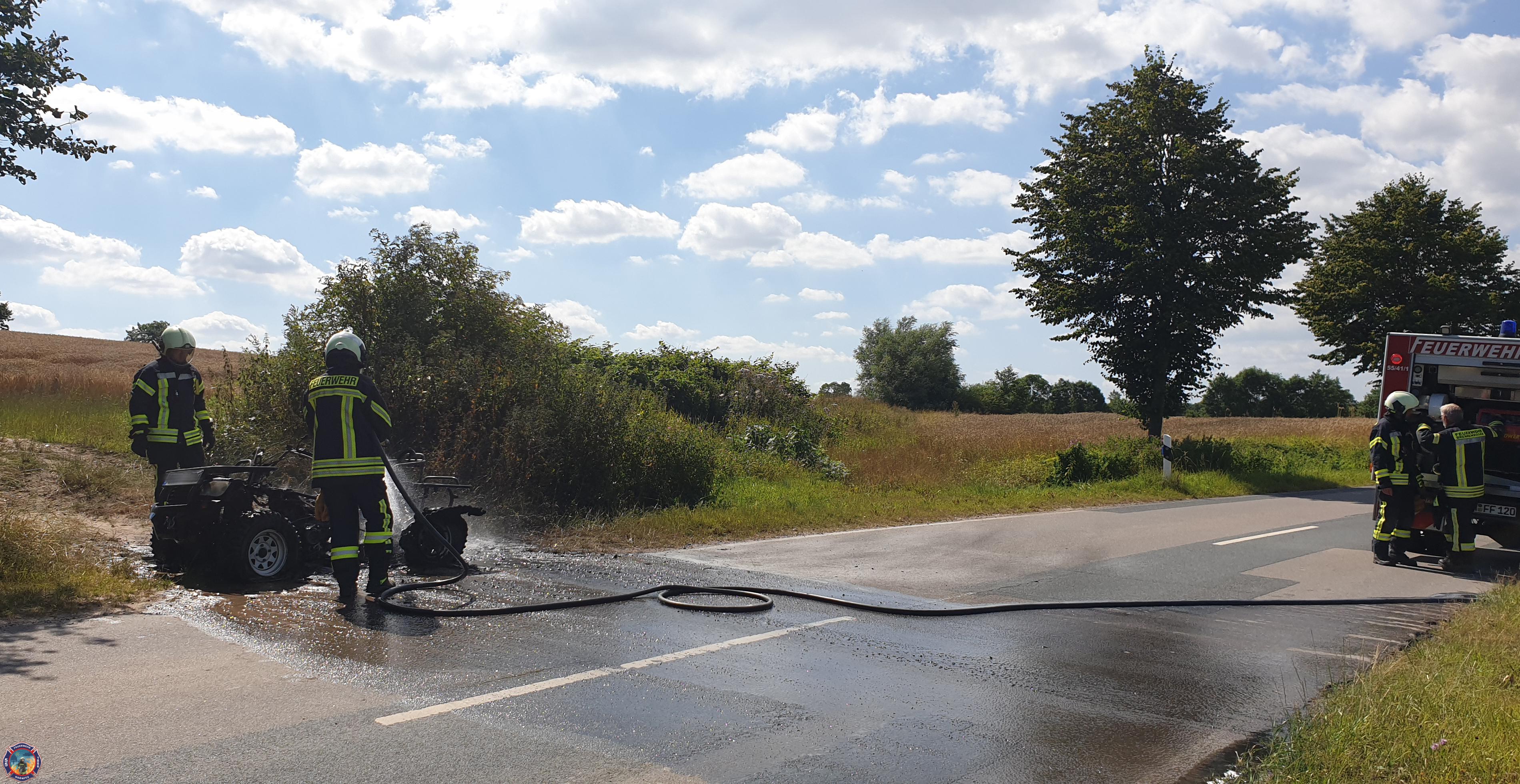 Brennt Quad -> In Brenkenhagen kam es zum Vollbrand eines Quads. Wir unterstützen die Brenkenhagener Kameraden, die das Feuer bereits unter Kontrolle hatten, bei den Nachlöscharbeiten. Die K 46 war für die Dauer der Löscharbeiten voll gesperrt. |
