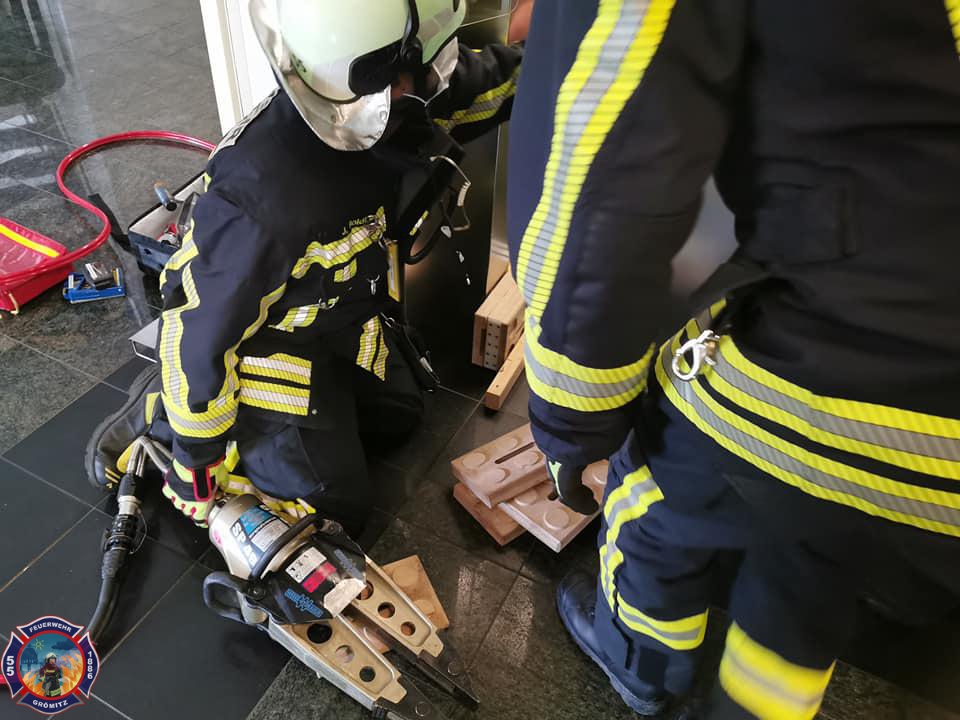 Mittels hydraulischem Rettungsgerät gelang es die Fahrstuhltür zu öffnen. Die Person konnte im Anschluss samt Rollstuhl aus der Fahrstuhlkabine getragen werden.