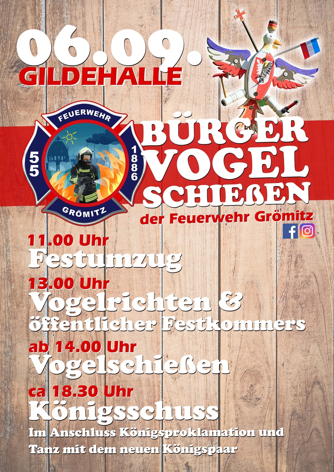 Wer wird neuer König? So heißt es Jahr für Jahr Anfang September. Ein ganzes Wochenende steht dann im Zeichen unseres Vogelschießens. Das stimmungsvolle Richten des Holzvogels gehört ebenso dazu wie der große Festumzug mit vielen Gästen befreundeter Feuerwehren und Vereine. Den Höhepunkt stellt jedes Jahr das Schießen auf den großen Holzvogel dar. 60 – 80 Schützen messen sich in zahlreichen Runden bis nach vielen Stunden das letzte Stück des Vogels zu Boden fällt und ein neuer König gefunden ist. Alle Besucherinnen und Besucher erwartet ein buntes Rahmenprogramm rund um die Gildehalle.