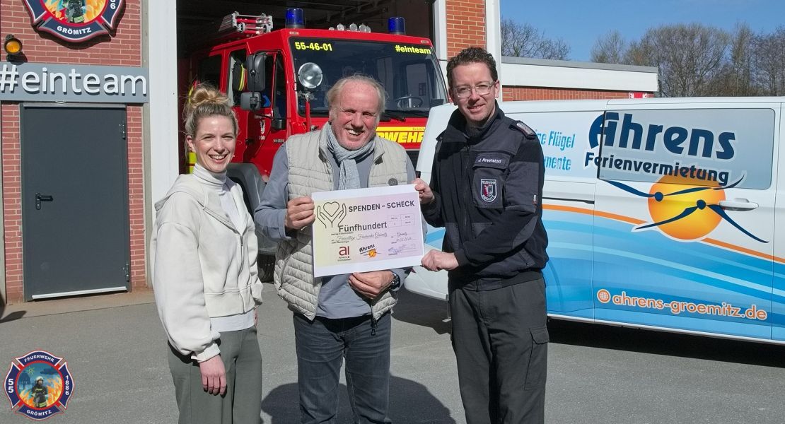 Wir können uns über ein ganz besonderes Geburtstagsgeschenk freuen. Anlässlich des 140. Bestehens der Feuerwehr Grömitz überreichten Michael Ahrens und Jana Schulz eine stattliche Spende in Höhe von 500 Euro. Geschäftsführer Michael Ahrens, der seit Jahren wiederkehrender Unterstützer