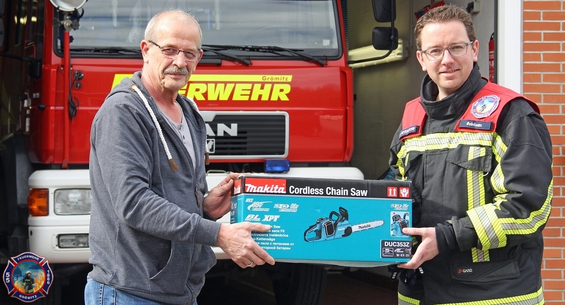 Tolle Überraschung am gestrigen Sonntag. Familie Ketzer/Halfmann vom Elektromeisterbetrieb Fritz Ketzer aus Duisburg, die bereits seit Jahrzehnten eine enge Verbindung nach Grömitz pflegt, überreichte unserem Wehrführer Jacob eine Akku-Kettensäge zur Optimierung unserer Ausrüstung und trat als passives Mitglied in unsere Wehr ein.