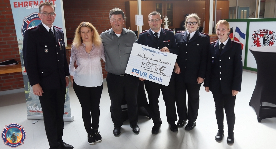 Im Rahmen unseres Bürgervogelschießens überreichten die beiden uns einen Spendenscheck in Höhe 1065,00 Euro. Gesammelt wurde die stolze Summe anlässlich der Silberhochzeit von André und Dana. Jeweils die Hälfte kommt nun der Jugendfeuerwehr und der Kinderfeuerwehr zu Gute. Vielen Dank !