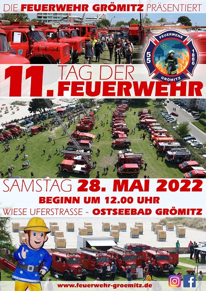 Der 11. TAG DER FEUERWEHR findet statt. 👍 Anmeldungen ab sofort möglich! Wir freuen uns sehr euch alle am 28. Mai 2022 auf der Wiese an der Uferstraße in Grömitz begrüßen zu dürfen. Weitere Infos gibt es hier.