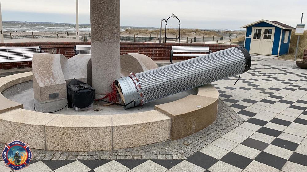 Lichtinstallation durch Sturm losgerissen -> Das betroffene Bauteil wurde gesichert und mit ins Gerätehaus verbracht um weitere Schäden zu vermeiden.