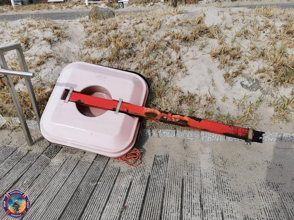 Ein durch Sturm abgerissener Rettungsring mit Gehäuse und Standfuß konnte zügig gesichert werden. |