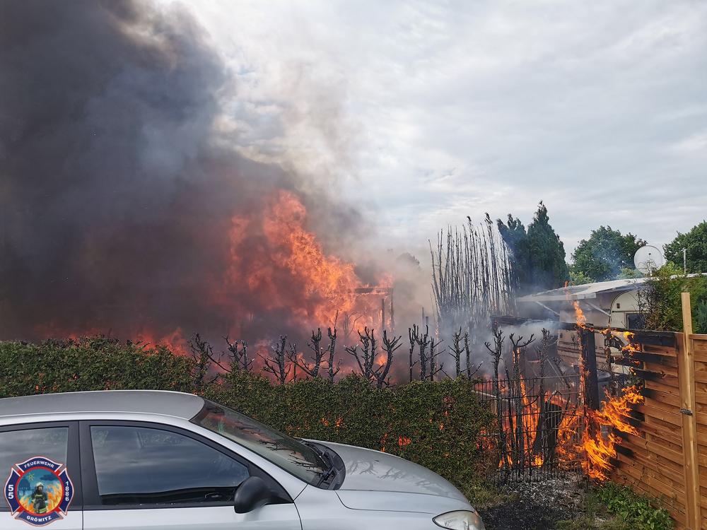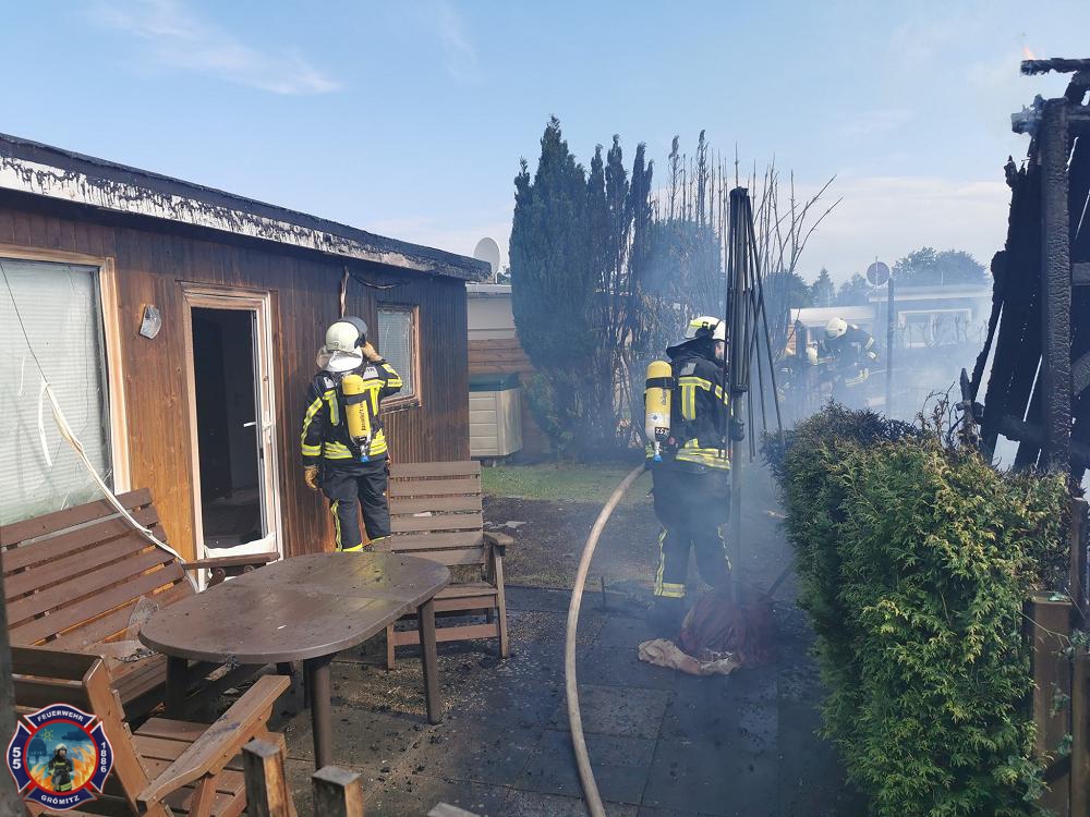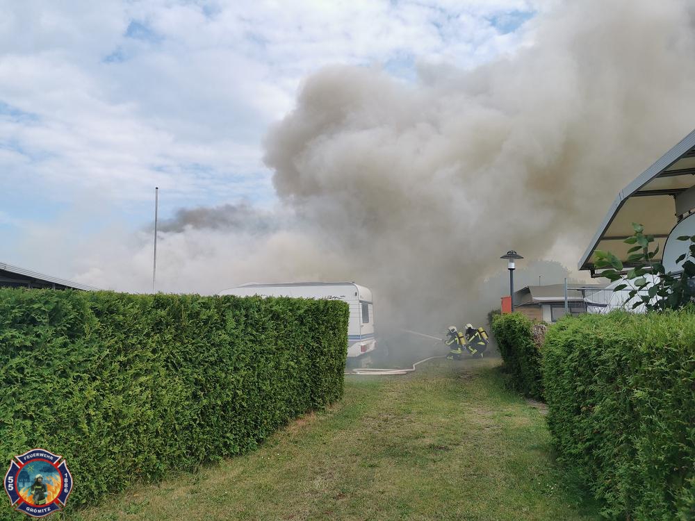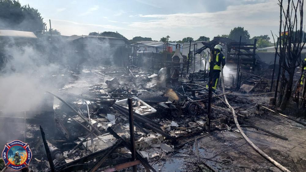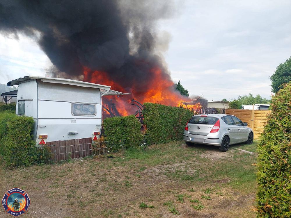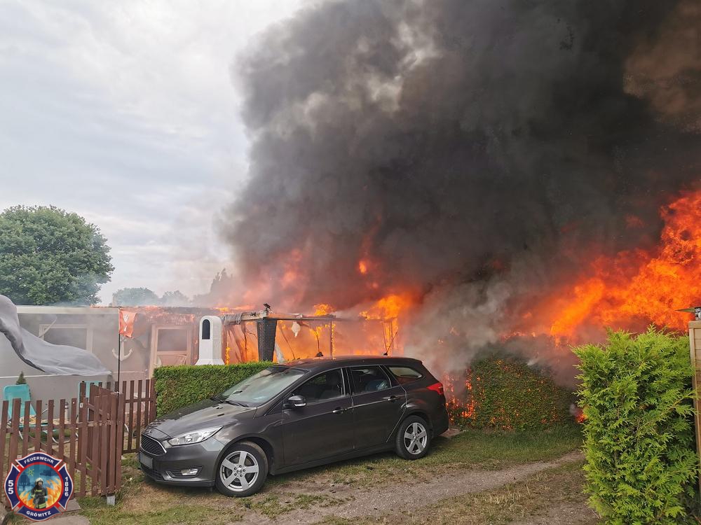Auf einem Campingplatz am Lensterstrand kam es zum Vollbrand zweier Wohnwagen. Auch ein Pkw fing Feuer. Zwei angrenzende Wohnwagen wurden durch die extreme Hitze in Mitleidenschaft gezogen.