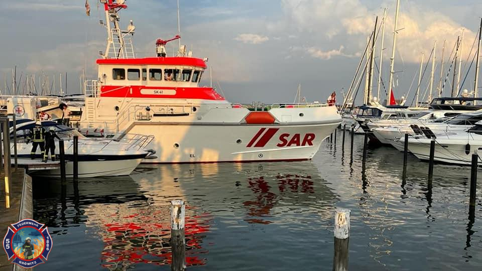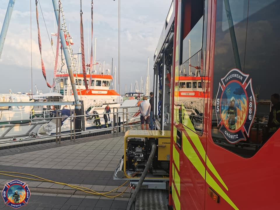 Motorraum von Boot voll Wasser gelaufen -> Wir unterstützten die Seenotretter bei einem Einsatz im Hafen und pumpten mehrere 1000 Liter Wasser aus dem Bootsinneren.