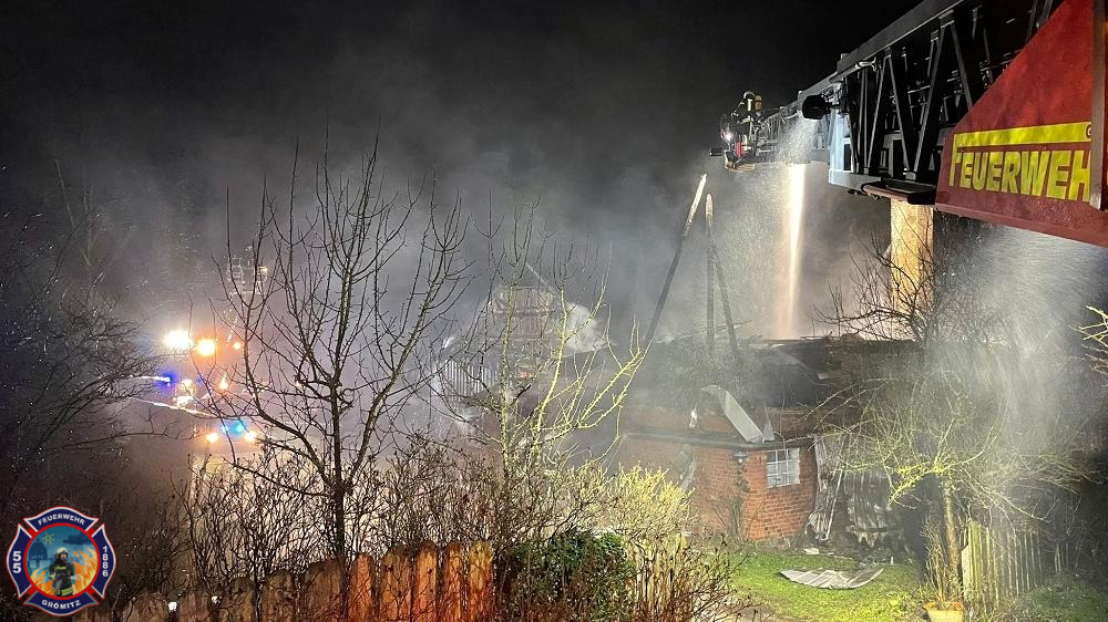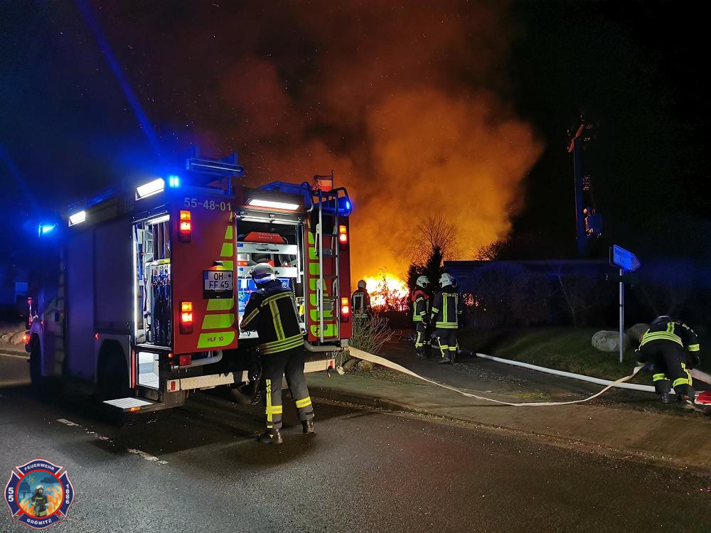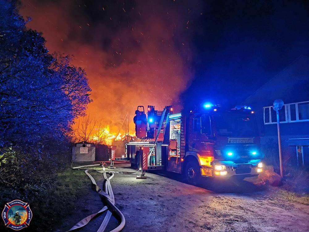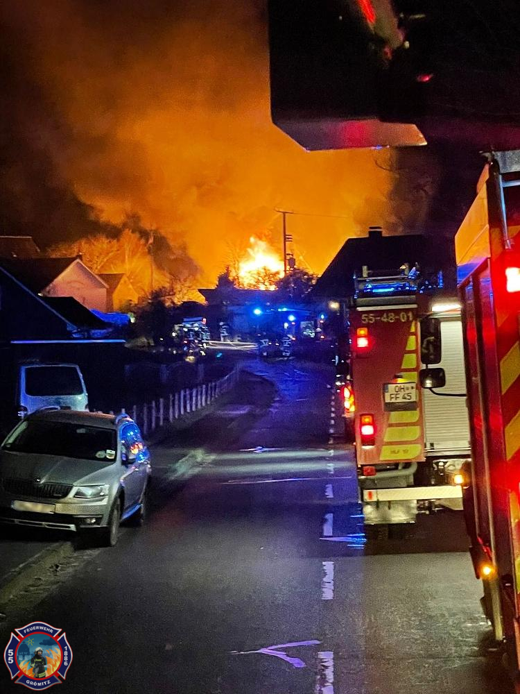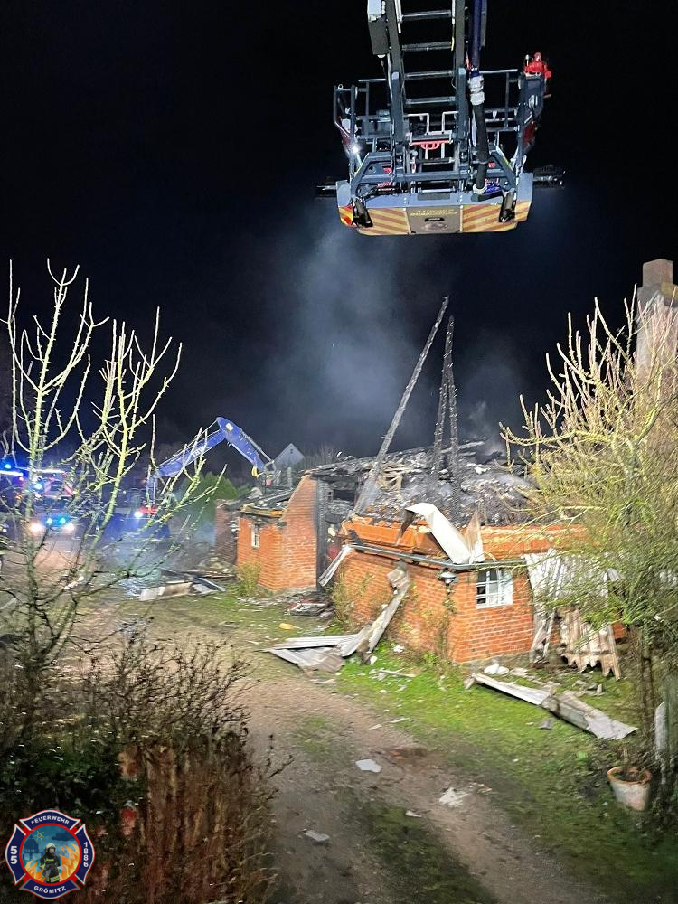 Flammen aus Fenster, Dach brennt -> Noch während der Ordnungsarbeiten nach unserem ersten Einsatz ereilte uns die zweite Alarmierung des Abends am Gerätehaus Grömitz. Wir unterstützen die örtlichen Feuerwehren bei einem Großbrand in Kassau, bei dem ein Gebäude vollständig niederbrannte. Es kamen mehrere Atemschutz-Trupps im Außenangriff zum Einsatz.