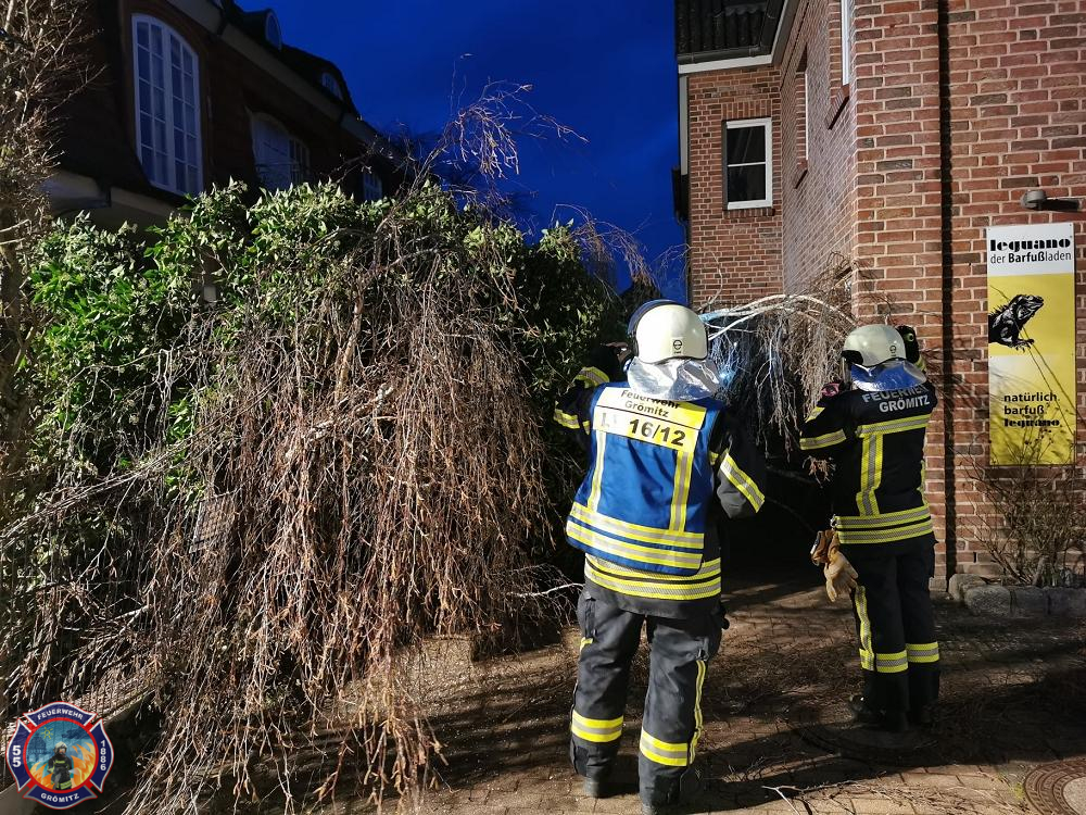 Ein Baum wurde entwurzelt und versperrte den Zugang zu einer Hauseingangstür. Mittels Motorkettensäge wurde für freien Zugang gesorgt.