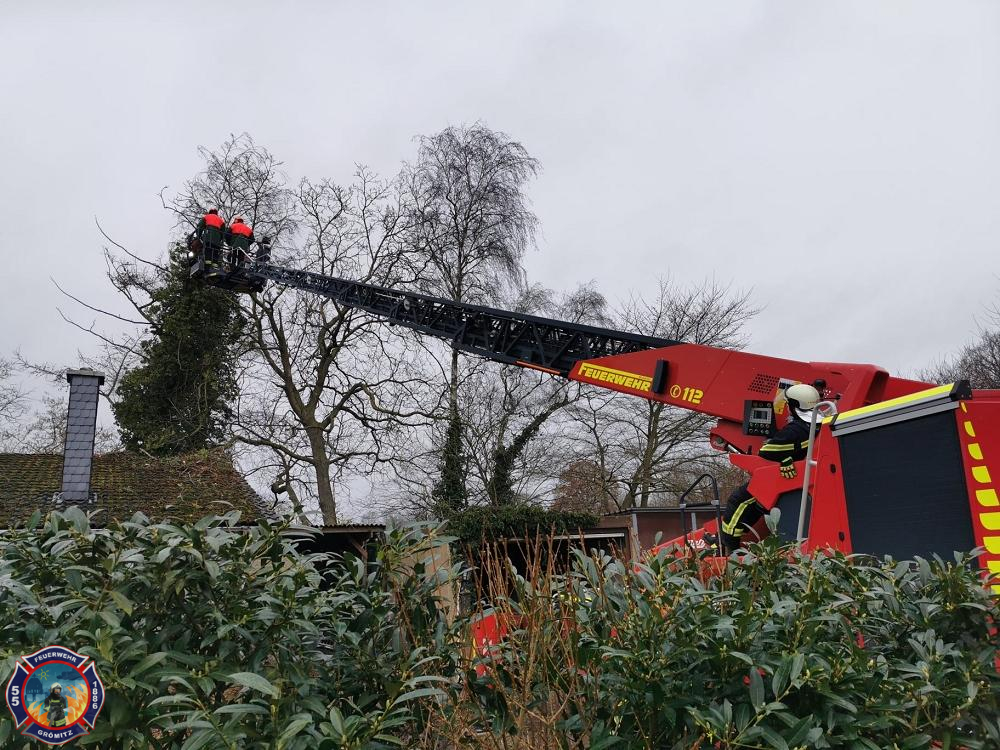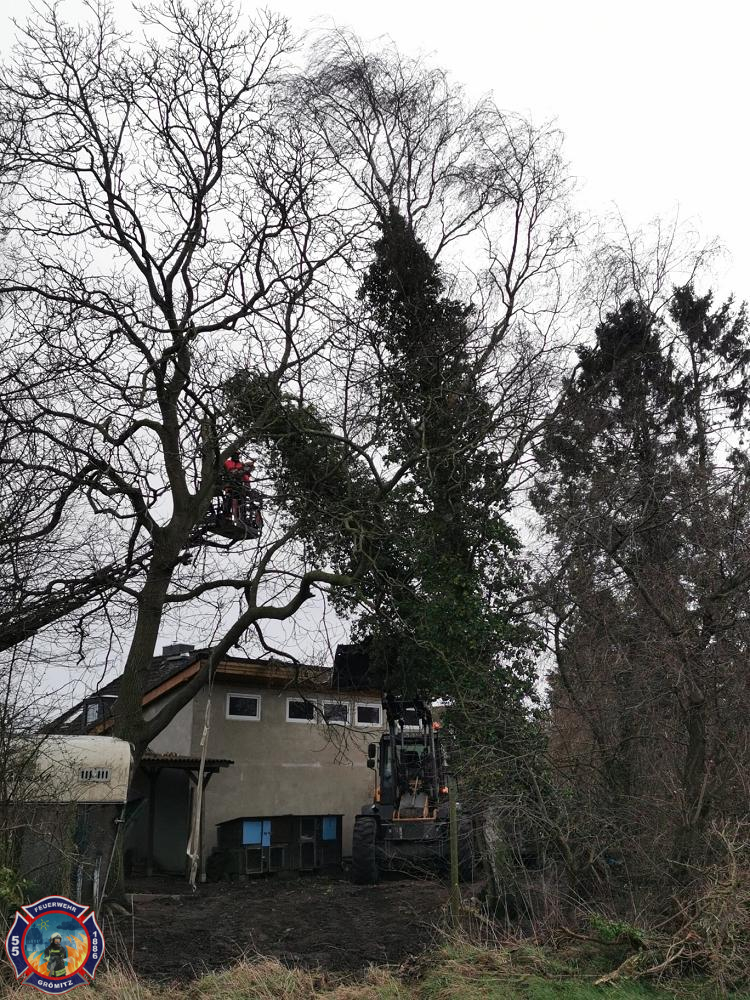 Mittels Kettensäge und Drehleiter wurde der Baum entfernt und drohte nicht mehr aufs Wohngebäude zu fallen. |