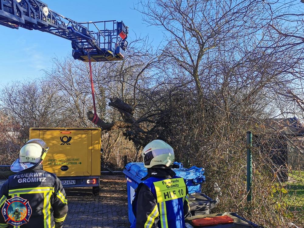 Mittels Motorkettensäge und Drehleiter konnte größerer Schaden abgewendet werden. |
