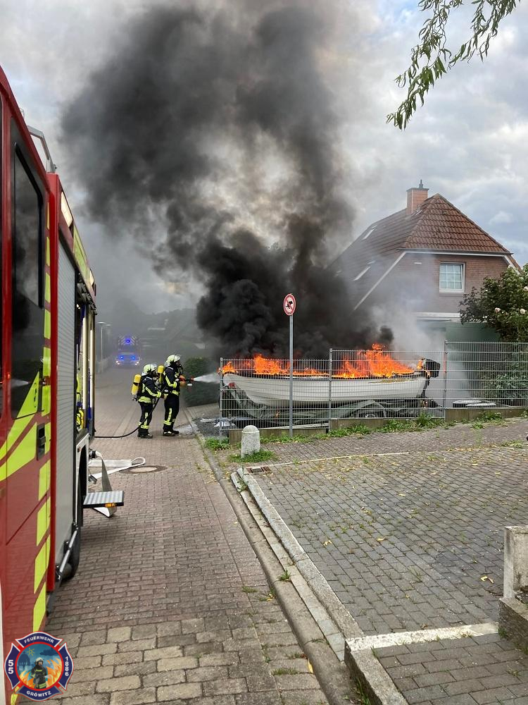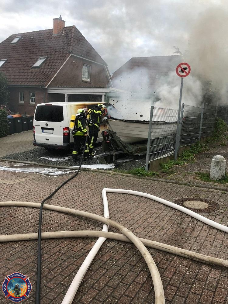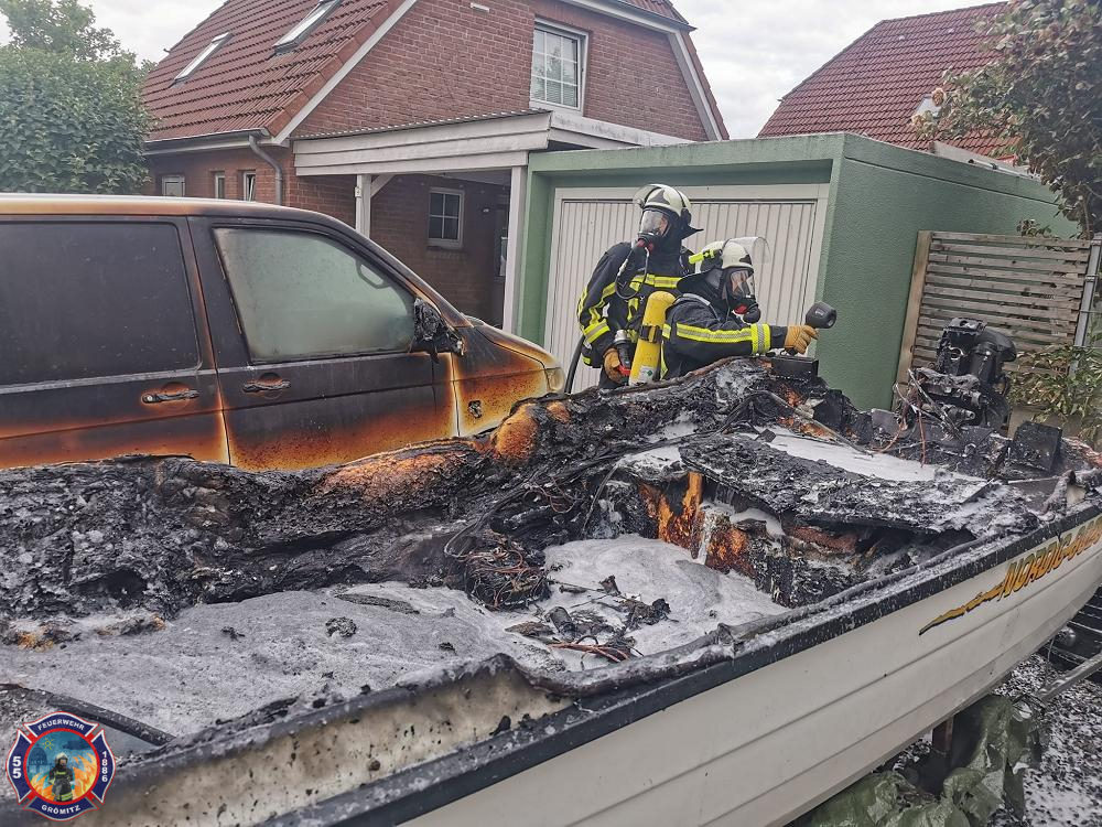 Brennt Boot neben Gebäude -> Mit einem Trupp unter Atemschutz konnte das Feuer schnell unter Kontrolle gebracht werden.