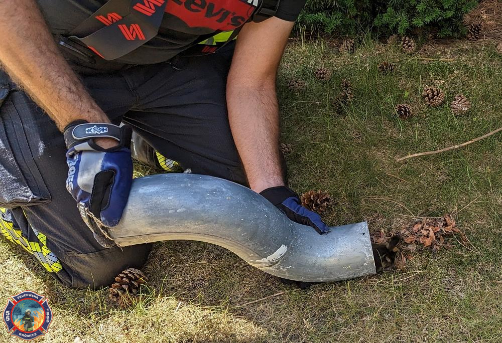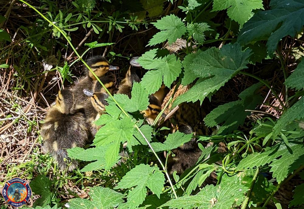 Entenküken in Not -> Ein Sturz aus größerer Höhe endete für zwei Entenküken im Fallrohr eines Appartementhauses. Mittels Steckleiter erkundeten wir diverse Regenrinnen und Fallrohre, bis die beiden Verschütteten gefunden waren. Durch die Demontage eines Rohrbogens gelang die Familienzusammenführung. |