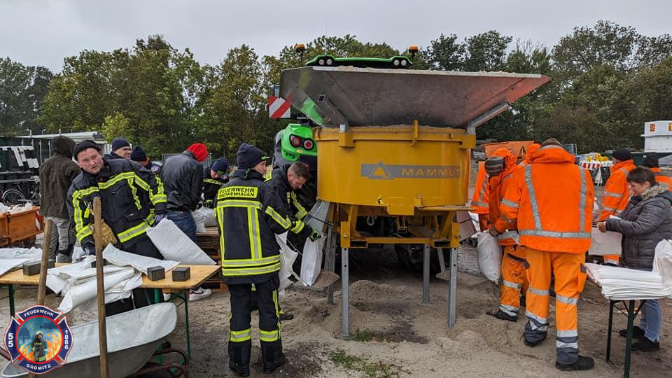 Sandsäcke füllen wegen steigendem Wasserstand.