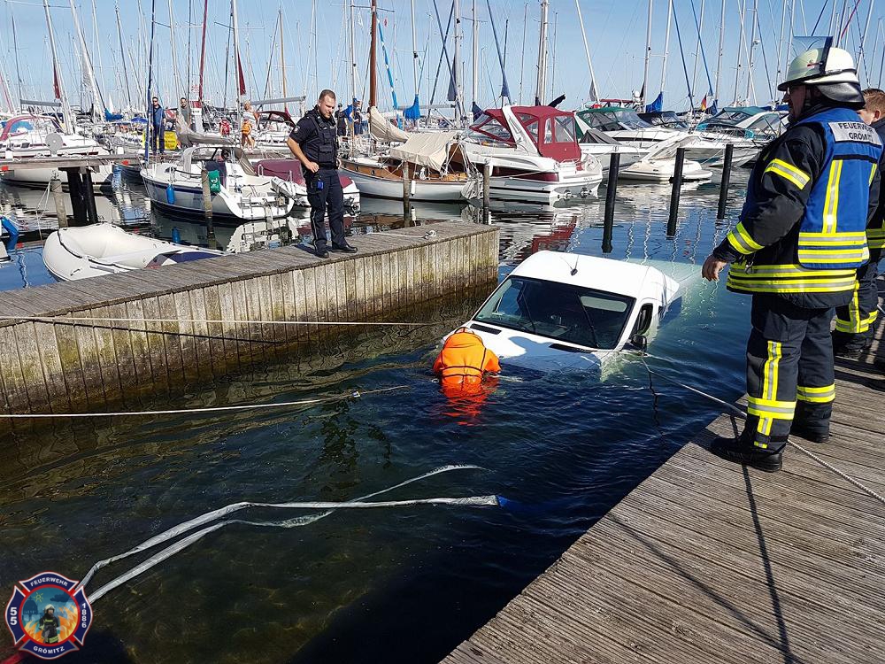 PKW an Slipanlage im Wasser - Fahrer im Fahrzeug -> Beim Zuwasserlassen eines Bootes ist das Zugfahrzeug samt Trailer ins Hafenbecken gerutscht. Die Person im Fahrzeug konnte sich eigenständig befreien. Mit Hilfe unseres HLF wurde der Lieferwagen aus dem Wasser gezogen.