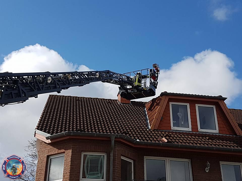 Dachziegel fallen vom Dach -> Wir entfernten die betroffenen Dachziegel mittels Drehleiter. |