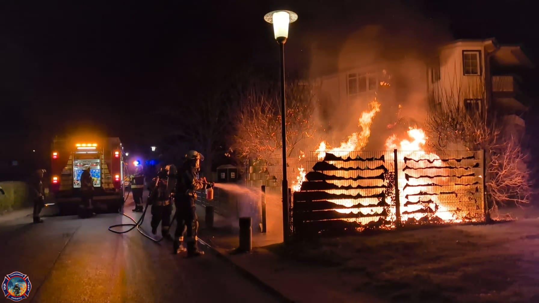 Ein gemeldeter Mülltonnenbrand entpuppte sich als Feuer zweier großer Müllcontainer sowie der angrenzenden Bepflanzung. Ein Trupp unter Atemschutz konnte das Feuer mittels Schnellangriff zügig löschen.
